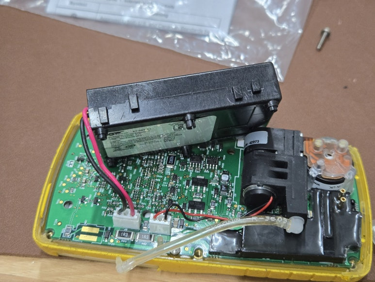 금번에 입고된 Honeywell GasAlert MAX XTII 제품은 상기 사진과 같이 내부에 충전지가 삽입되어 있습니다. 그리고 충전지는 PCB 기판과 소켓방식을 결합되어 교환이 가능합니다. 제품을 열어서 배터리를 교환하려면 사진에 보이는 튜빙과 진동모터 등을 신경써야 하지만 우선 이렇게 소켓방식으로 구성되어 있다는 것 자체가 가스측정기 수리업을 하는 입장에서는 매우 반갑습니다.