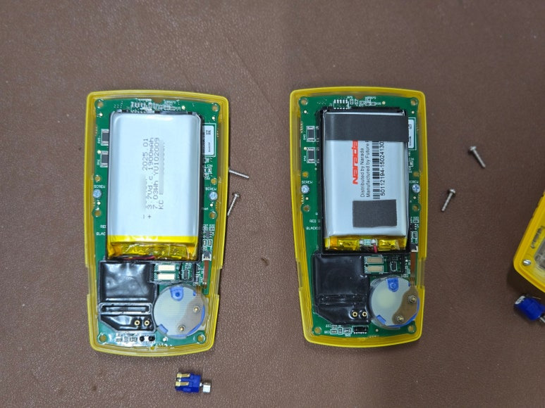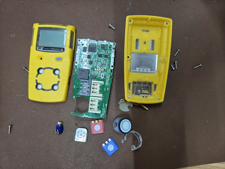 배터리가 부풀어 오르게 되면 배터리를 교체해야합니다. Micro clip XL 의 경우 케이스를 제외하면 상기 사진과 같이 LEL, CO, H2S, O2센서와 센서 분리기판, 진동모터 그리고 배터리가 연결된 PCB 기판으로 구성됩니다.