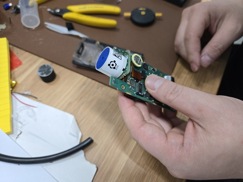 해당 가스측정기의 구성은 Honeywell Minimax XP 와 유사합니다. 하단에 CR2 배터리가 사용되어 2년 동안은 별도의 배터리 교체 없이 사용이 가능하고 교체가능한 센서가 상단에 위치합니다. 한가지 특이한 것은 대부분의 단일가스 측정기가 PCB 메인기판에 직접 센서가 장착되는 데 반해 GasBadge Pro 의 경우 센서 분리기판이 적용되어 있다는 것입니다. 센서의 교체주기를 경과할 경우 누액이 발생하여 기판을 오염시킬 수 있는데 누액이 발생해도 작은 분리기판만 교체하면 되므로 이와 같은 분리기판 적용은 유지보수 비용을 절감할 수 있다는 점에서 상당히 긍정적입니다.