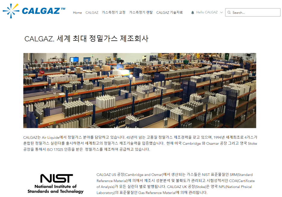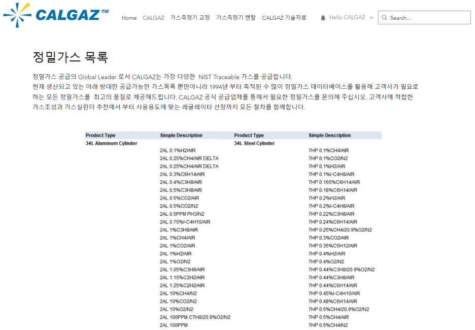 당사 홈페이지 주소는 http://calgaz.co.kr 입니다. 방문하시면 상기와 같이 CALGAZ 제품에 대한 소개를 통해 왜 CALGAZ가 업계에서 가장 신뢰받은 정밀가스 제조업체인지 확인하실 수 있습니다.
