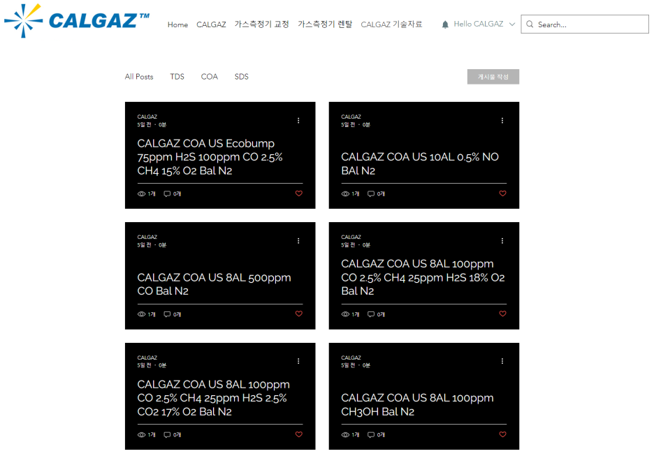 홈페이지의 CALGAZ 기술자료페이지에는 가스실린더와 레귤레이터에 대한 기술사양자료(TDS)와 생산된 가스의 시험성적서(COA) 견본 그리고 안전보건자료(SDS)를 다운로드 받으실 수 있습니다. 해당 문서는 가스공급시에 별도로 제공되나 고객사의 편의를 위해 DB화 시켜 홈페이지에 함께 업로드하고 있습니다.