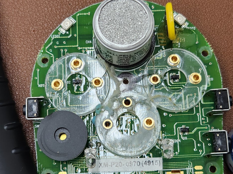 누액에 의해 손상된 PCB 기판의 모습입니다. 이 정도 상태가 되면 수리가 가능할지 여부는 천운에 달렸다고 할 정도로 수리 가능성이 매우 낮습니다. 최선을 다해 기판을 세척하고 센서가 부착되는 전극의 오버홀 작업을 진행했습니다. 운 좋게도 손상이 자주 발생하는 CO센서와, H2S센서 영역은 재생이 가능했습니다.