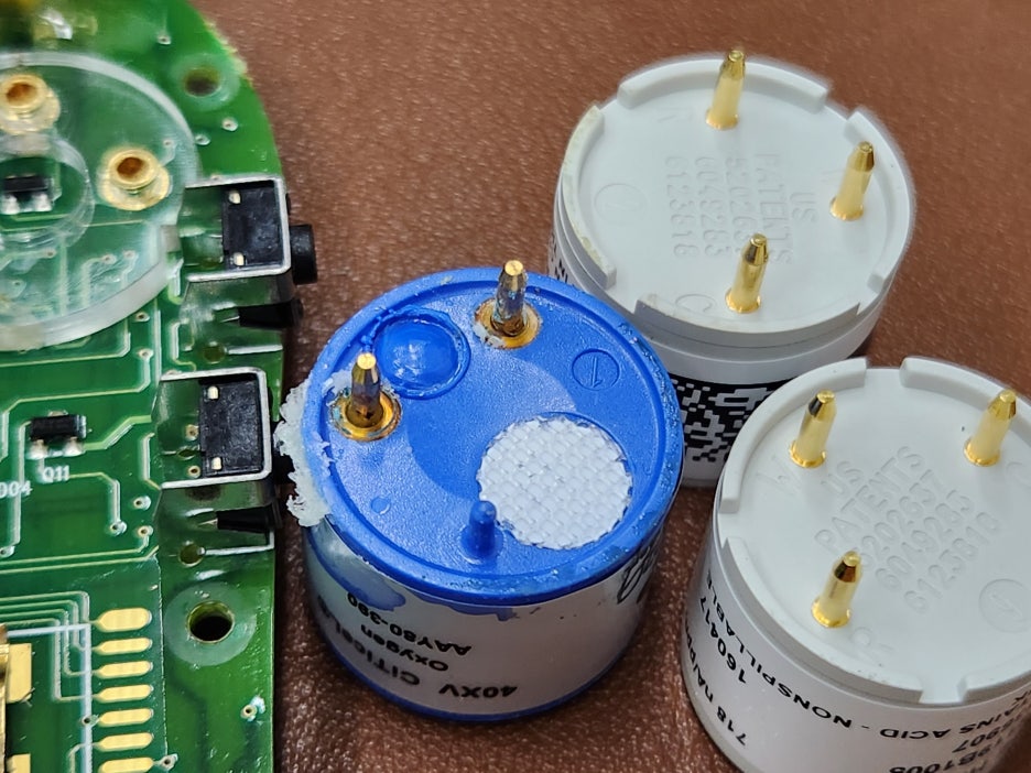 산소센서를 분리해 보면 Honeywell Citicel 산소센서의 특징인 산소센서 누액이 관찰됩니다. 2016년 제조 후 한번도 센서가 교체된 이력이 없는 만큼 누액의 정도도 매우 심각합니다.