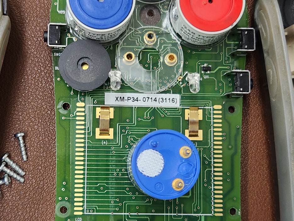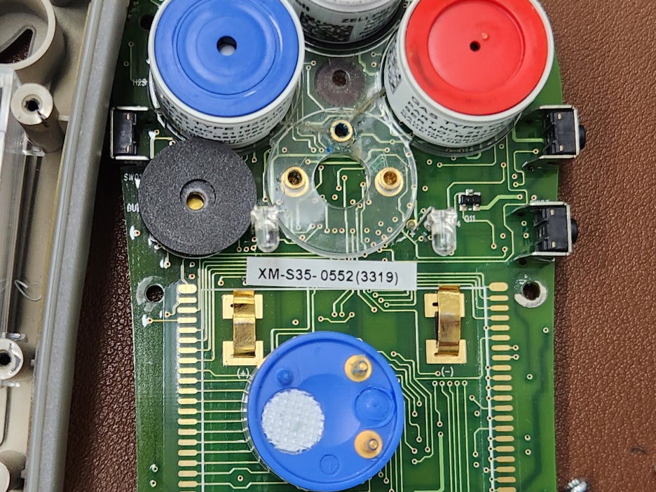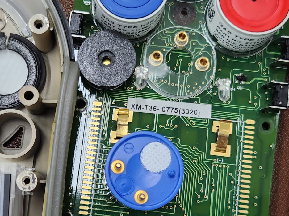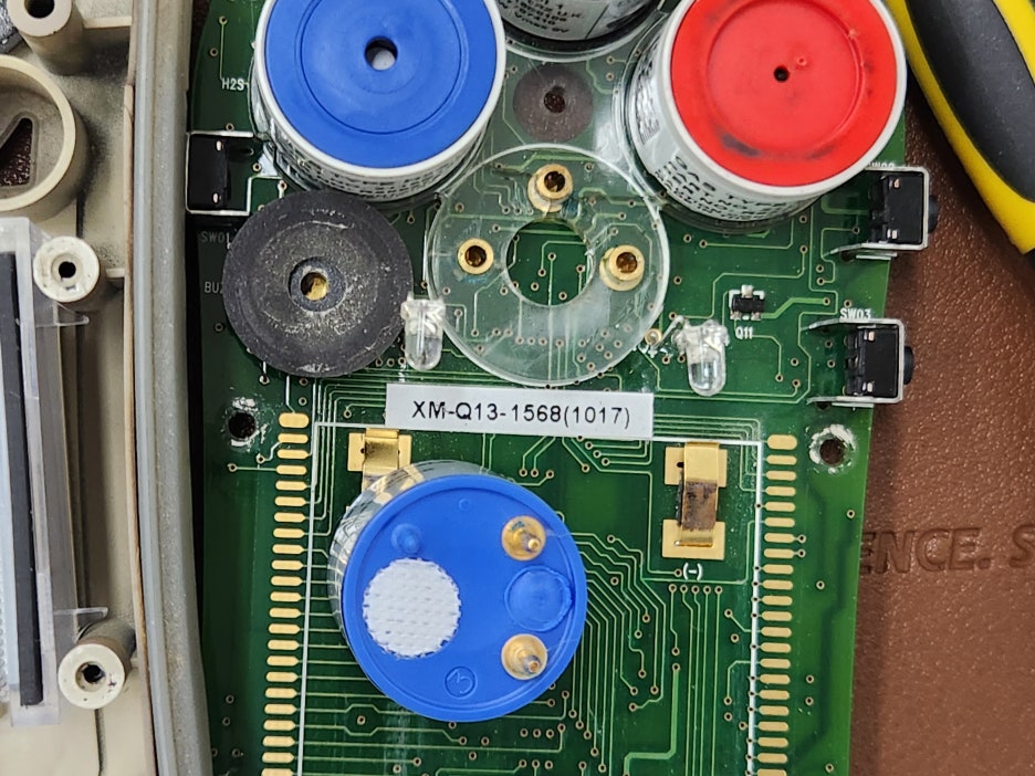산소센서의 센서액 누출이 심할경우에도 쉽게는 구분이 안되지만 자세히 보면 기판 손상을 알 수 있는 방법이 있습니다. 위 사진을 보면 투명한 동그라미 위에 전극이 꼽혀 있는 것을 볼 수 있습니다. 이 중 하단부 동그라미가 산소센서가 위치하는 곳 입니다. 그리고 좌측이 황화수소센서, 우측이 일산화탄소 센서 자리입니다. 산소센서 자리의 경우 몇개월만 사용해도 지저분해 지기 마련이지만 황화수소센서 자리와 일산화탄소센서 자리는 산소센서만 적기에 교체해 주면 오염이 발생하지 않습니다. 상기 사진에서는 좌측의 황화수소 센서 부위가 오염된 것으 확인할 수 있습니다.