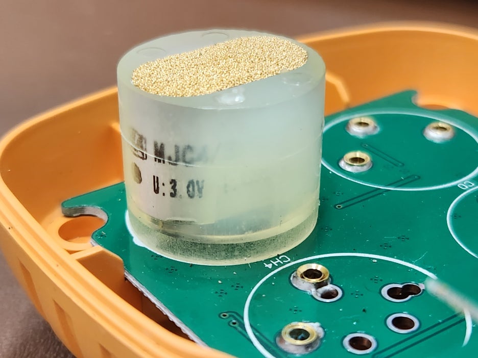 이상있는 산소센서만 교체된 사진입니다. 산소센서가 교체 기한이 많이 경과하지 않은 시점에서 입고되어 기판에 붙어있는 소량의 누출된 센서액만 세척하고 수리를 완료할 수 있었습니다.