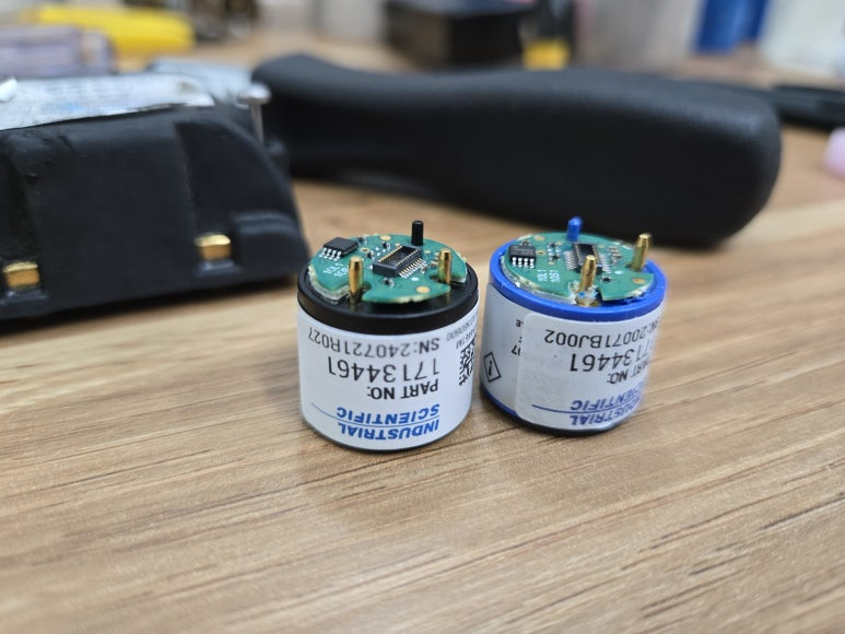 이 제품또한 Honeywell Minimax X4를 비롯한 대부분의 가스측정기와 같이 2년반 정도의 수명을 갖는 산소센서가 장착되어 있습니다. 사진에서 우측 파란색 센서를 보면 장기간 사용으로 인해 센서액이 전극부위로 누출된 것을 확인할 수 있습니다. 따라서 이 기기또한 정기적인 산소센서 교체가 필요하며 그렇지 못할 경우 센서누액으로 기판 손상이 발생할 수 있습니다. 좌측의 검정색 센서가 이번에 교체할 신규 입고된 산소센서입니다. 같은 파트넘버를 갖고 있지만 신규 센서의 경우 색상이 변경된 것을 알 수 있습니다.