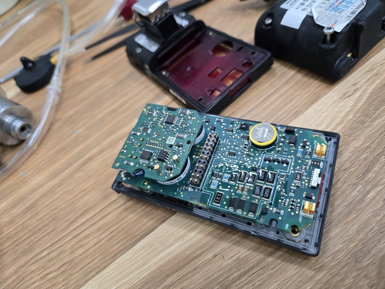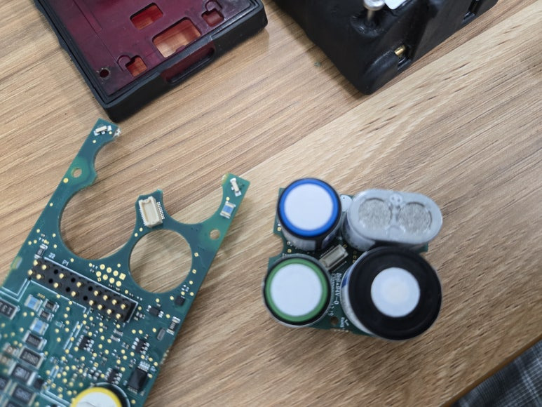 기기를 분해해서 PCB 기판을 살펴보면 센서기판과 메인기판이 분리된 형태를 볼 수 있습니다. 이러한 구성은 SENKO 복합가스 측정기나 HT-1805와 같은 중국제 가스측정기에서 많이 볼 수 있는 형태입니다. Honeywell Minimax X4가 통합PCB 기판형태로 산소센서 누액에 의한 기판손상이 발생하면 고가의 수리비용이 발생하는 것을 어느정도 보완한 구성이라고 생각할 수 있습니다. 하지만 실제로 누액이 발생하는 것은 산소센서 하나이기 때문에 산소센서만 분리기판을 구정하는 Honeywell Microclip XL이나 Honeywell Gas Alert MAX XTII 대비 효율성이 높다고 보이지는 않습니다.